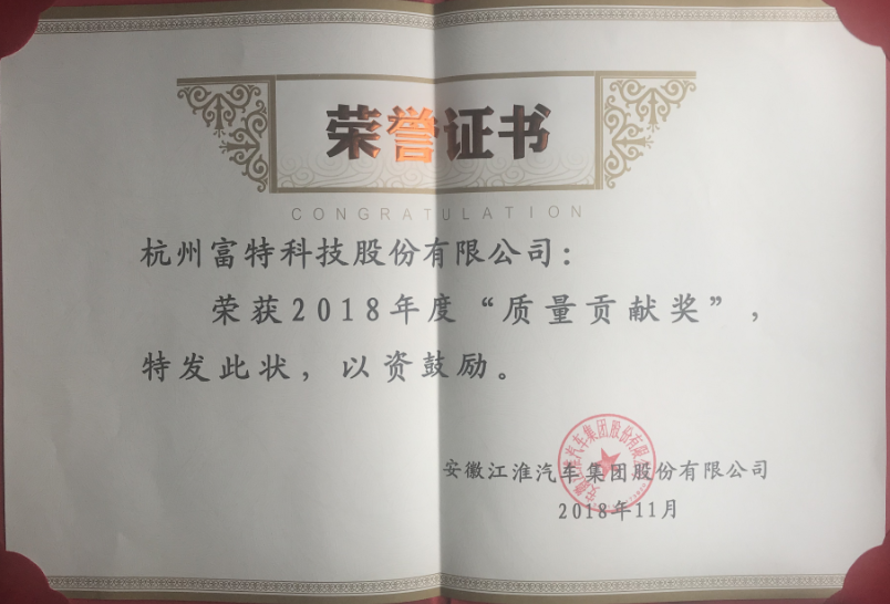 2018年11月26日,公司在江淮汽車集團主辦的年度供應商大會上榮獲2018年度“質量貢獻獎”,為公司零缺陷的經營目標再添一筆精彩的注腳。總經理李寧川先生親自出席并登臺領獎,充分顯示了公司對這一獎項的高度重視。